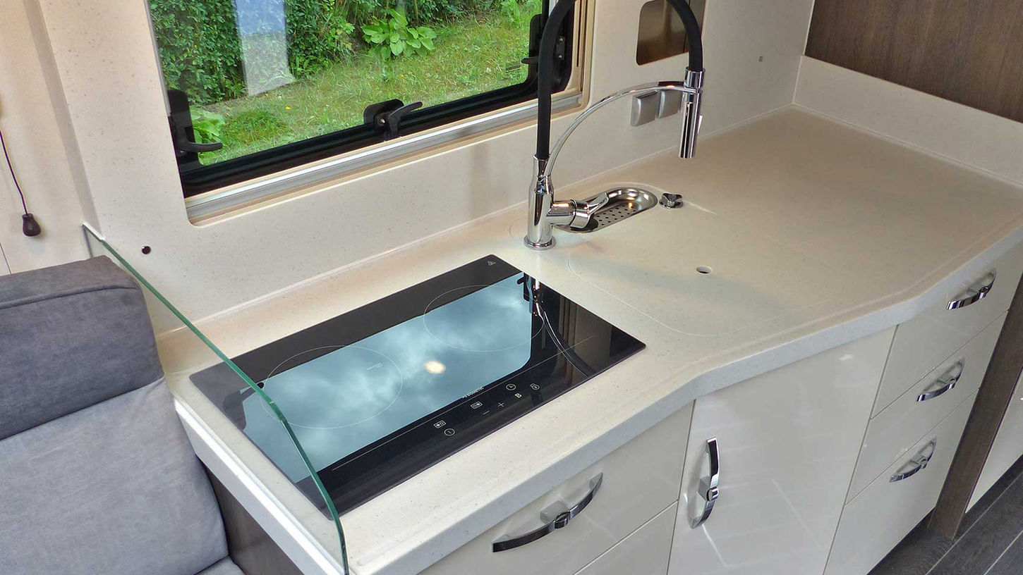 Im mittleren Teil des Reisemobils befindet sich eine großzügige Längsküche. Auf der hochfesten Mineralgranit-Arbeitsfläche sind ein Dreiflammenkocher mit elektrischer Zündung sowie eine große Rechteckspüle integriert, deren Abdeckung gleichzeitig als zusätzliche Ablagefläche dient. Geräumige Schubfächer für Kochgeschirr und Vorräte sowie ein Unterschrank mit integriertem Abfalleimer vervollständigen die durchdachte Küche. Gegenüber befindet sich der hochgesetzte Kompressorkühlschrank.